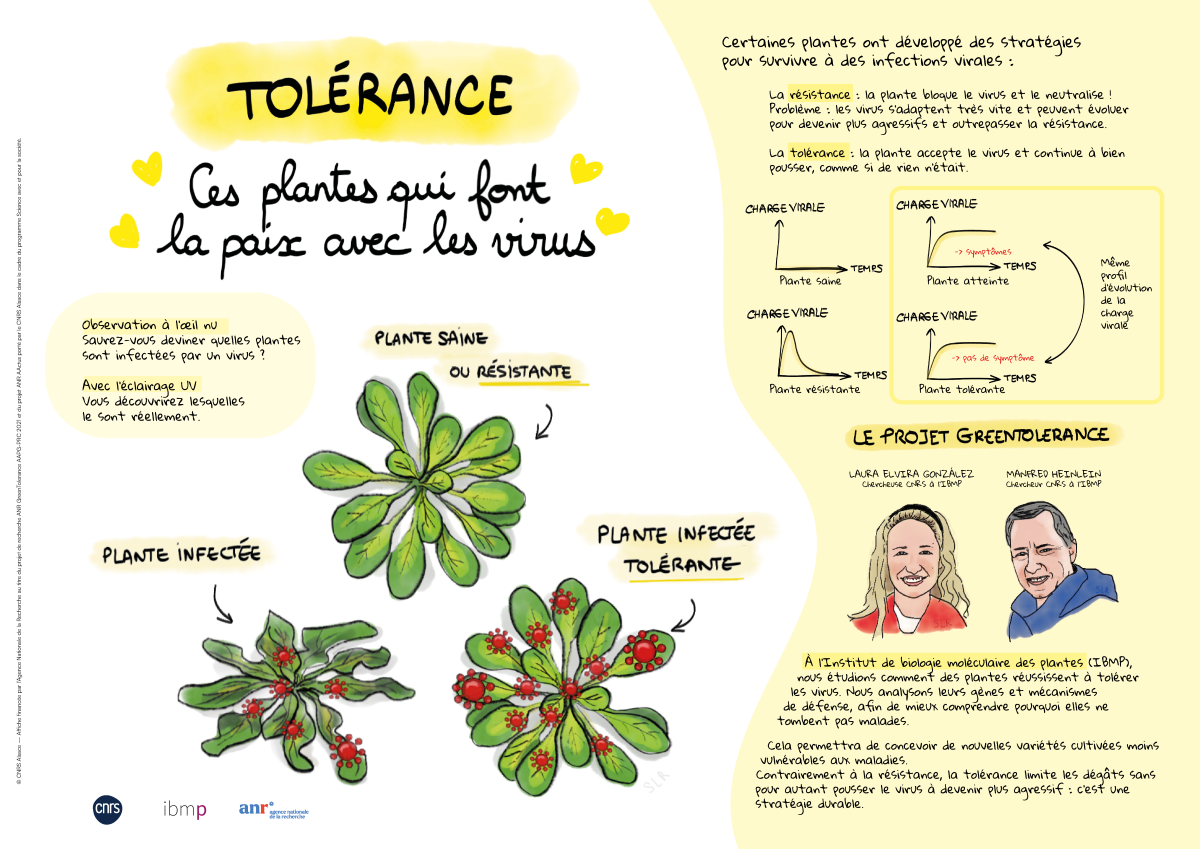 Découvrez en image la façon dont certaines plantes survivent aux infections virales. Support visuel conçu et réalisé par le CNRS Alsace pour Laura Elvira González et Manfred Heinlein de l'Institut de biologie moléculaire des plantes dans le cadre du programme "Science avec et pour la société" de l'Agence nationale de la recherche