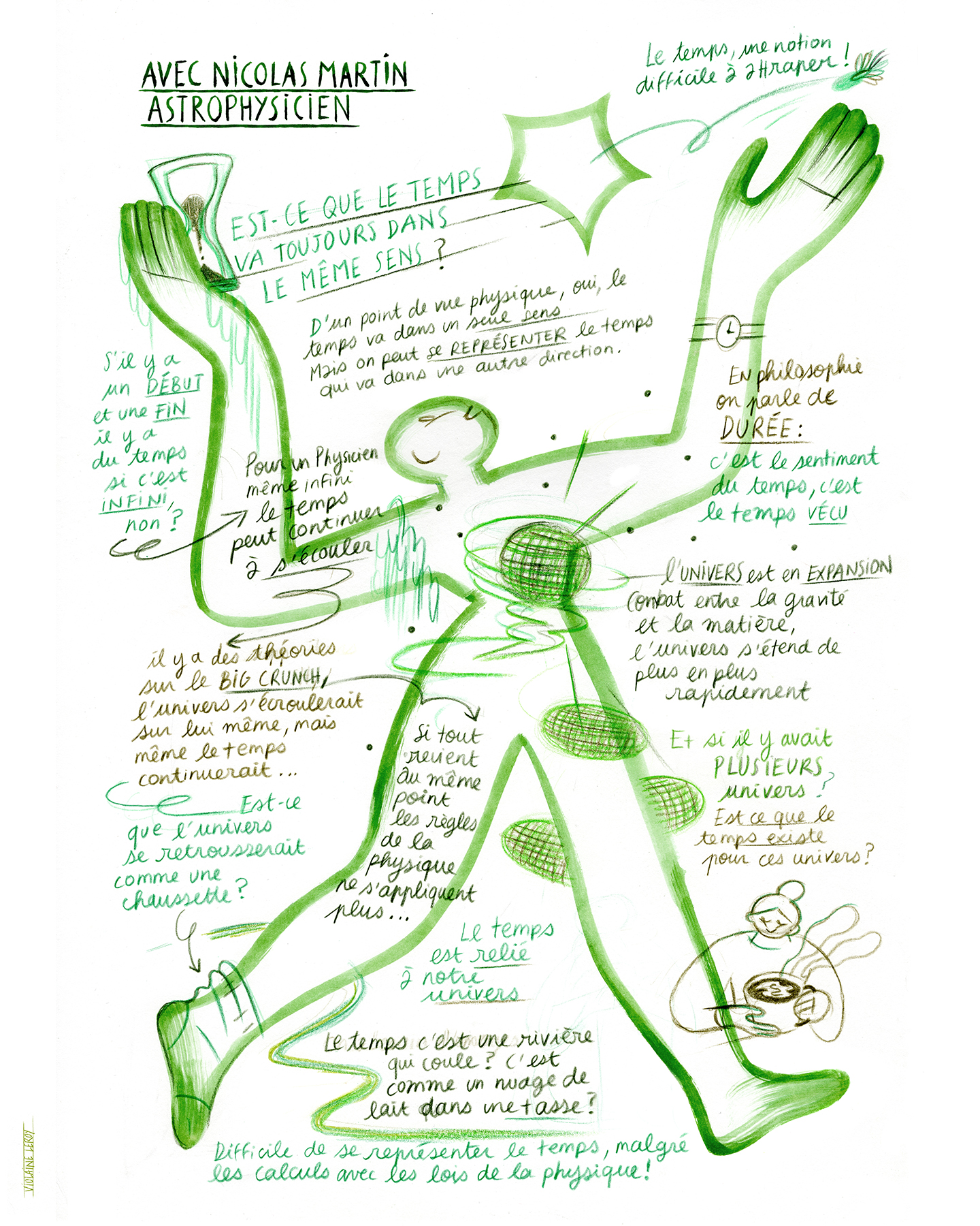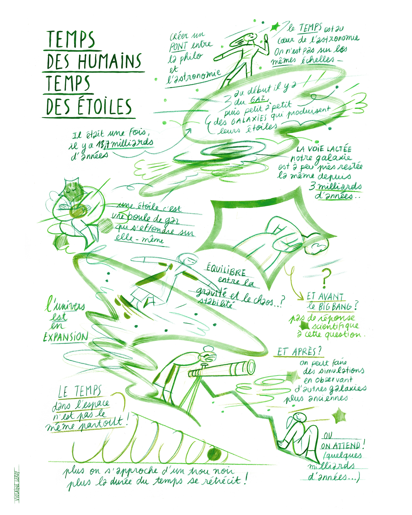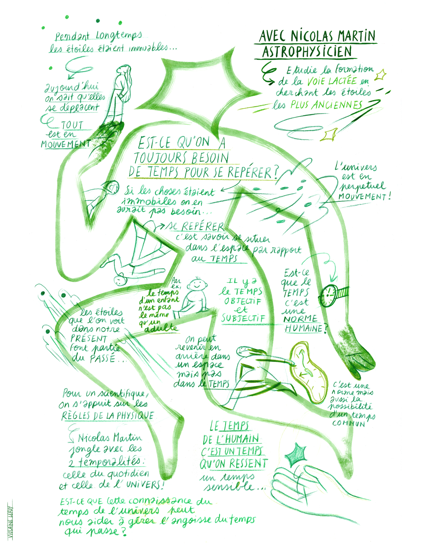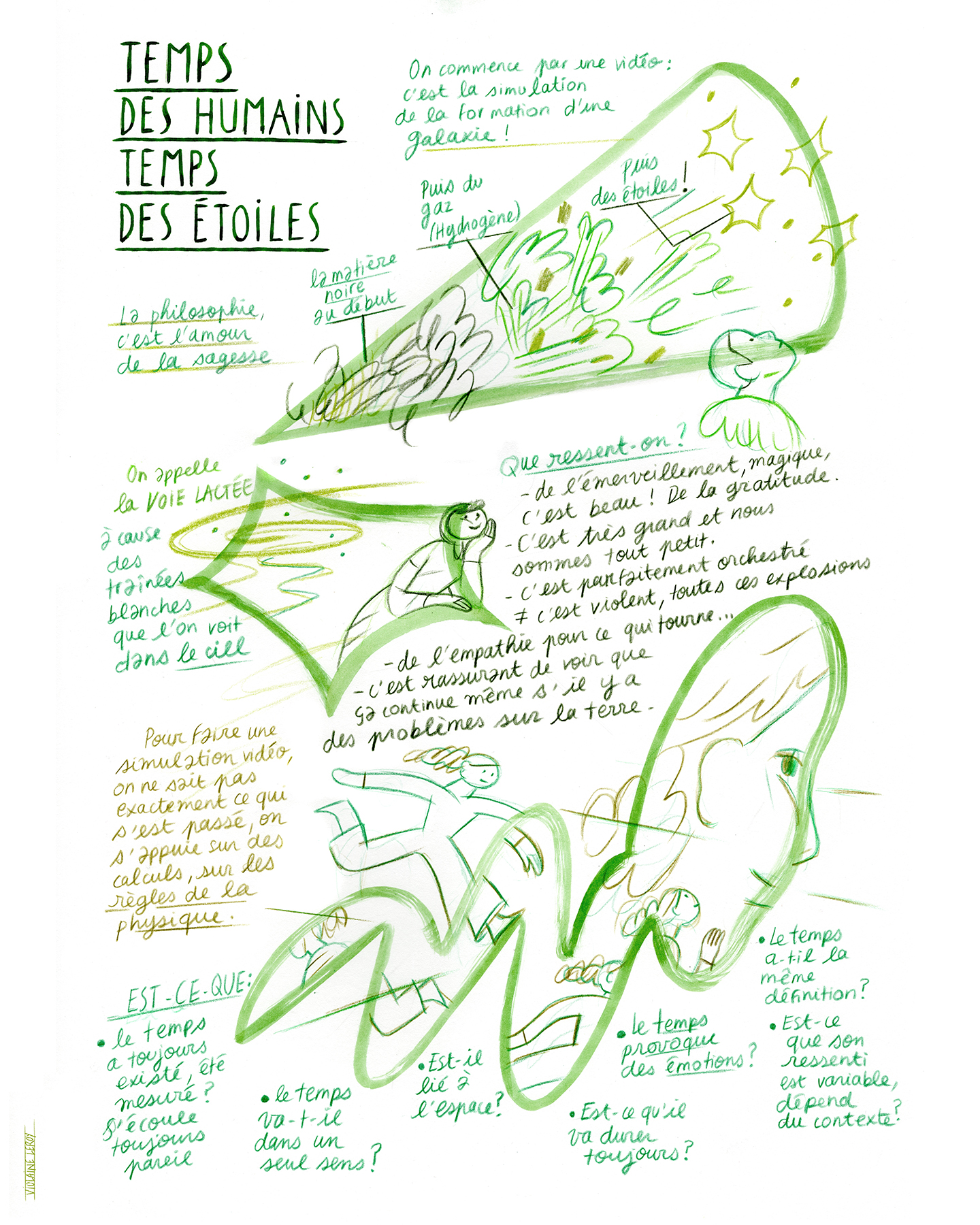 Dans un cercle de chaises de 15 personnes, des participants de tout âges se sont interrogés collectivement sur la notion du temps, guidés par la philosophe Elise Tourte. Nicolas Martin, chercheur CNRS à l'Observatoire astronomique de Strasbourg, a enrichi l'atelier de notions et de réflexion qui concernent sa conception du temps en tant qu'astrophysicien. Violaine Leroy (Instagram), facilitatrice graphique, était présente sur place pour garder trace de ces réflexions.